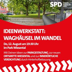 Wie entwickelt sich Waghäusel weiter, ohne, dass der Charme verloren geht, den alle lieben? Zu dieser Frage wollen wir im Park Wiesental bei unserer Ideenwerkstatt ins Gespräch kommen. Vor allem die Umgestaltung der Ortsmitte in Wiesental und die Hinterhofbebauung beschäftigen uns. Alle Interessierten sind herzlich zur Ideenwerkstatt in den Park Wiesental eingeladen: Am Do, 12.08. um 19:30 Uhr in den Park Wiesental