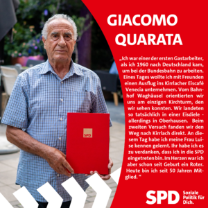 Giacomo ist eines von 400.000 SPD-Mitgliedern, die gemeinsam soziale Politik für Dich machen. Selten war das wichtiger als heute. Denn wie schaffen wir mit Klimaschutz die Ar-beitsplätze von morgen? Wie sorgen wir für bezahlbare Mieten und stabile Renten? Wie bauen wir eine Gesellschaft des Respekts?