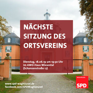 Die nächste Sitzung des Ortsvereins findet kommenden Dienstag, den 18. Juni 2019 um 19:30 Uhr im AWO-Haus Wiesental (Schanzenstraße 17) statt. Alle Interessierten sind wie immer herzlich eingeladen.