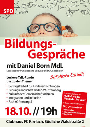 Die SPD Waghäusel lädt alle interessierten Bürger herzlich zu den „Bildungsgesprächen“ ein. In lockerer Runde möchten wir uns mit Ihnen zu Themen wie Beitragsfreiheit für Kindereinrichtungen, der Bildungslandschaft im Bundesland, der Zukunft von Sprach-Kitas, Fragen der Inklusion und dem Fachkräftemangel im Bildungssektor austauschen.