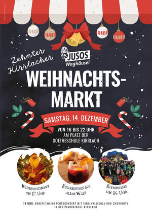 Es ist wieder Zeit für den Kirrlacher Weihnachtsmarkt: Am Samstag, den 14. Dezember öffnet der 9. Kirrlacher Weihnachtsmarkt ab 16 Uhr seine Tore am Platz an der Goetheschule (St. Leoner-Straße). In diesem Jahr erwartet alle Besucherinnen und Besucher ein buntes Angebot - Vereine aus Waghäusel kümmern sich um die Bewirtung.