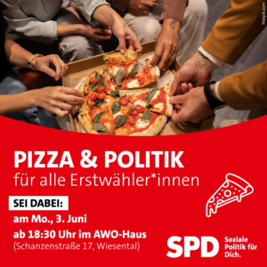 Gemeinsam mit allen Jungwähler*innen möchten wir beim Pizzaessen am 3. Juni über eure Themen sprechen. Gib uns deine Ideen bei gratis Pizza persönlich mit auf den Weg. Am Mo, 03.06., um 18:30 Uhr im AWO Haus Wiesental (Schanzenstraße 17). Bring gerne Freundinnnen und Freunde mit - wir freuen uns auf dich!