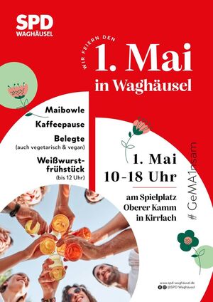 1. Mai, 10 bis 18 Uhr: Unser traditionelles Maifest findet in diesem Jahr am Spielplatz Oberer Kamm in Kirrlach (am Dutlacher Graben, gegenüber dem ehemaligen Eiskaffee Enza) statt. Wie immer erwartet Besucherinnen und Besucher ein buntes Angebot an Getränken und Essen. Von 10 bis 12 Uhr laden wir zum Weißwurstfrühstück ein.