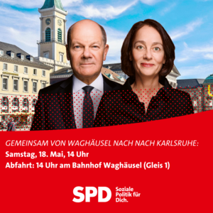 Am Samstag, den 18. Mai, besuchen wir unseren Bundeskanzler Olaf Scholz mit der SPD-Spitzenkandidatin für die Europawahl, Katarina Barley, in Karlsruhe bei der Europa-Kundgebung am Marktplatz.